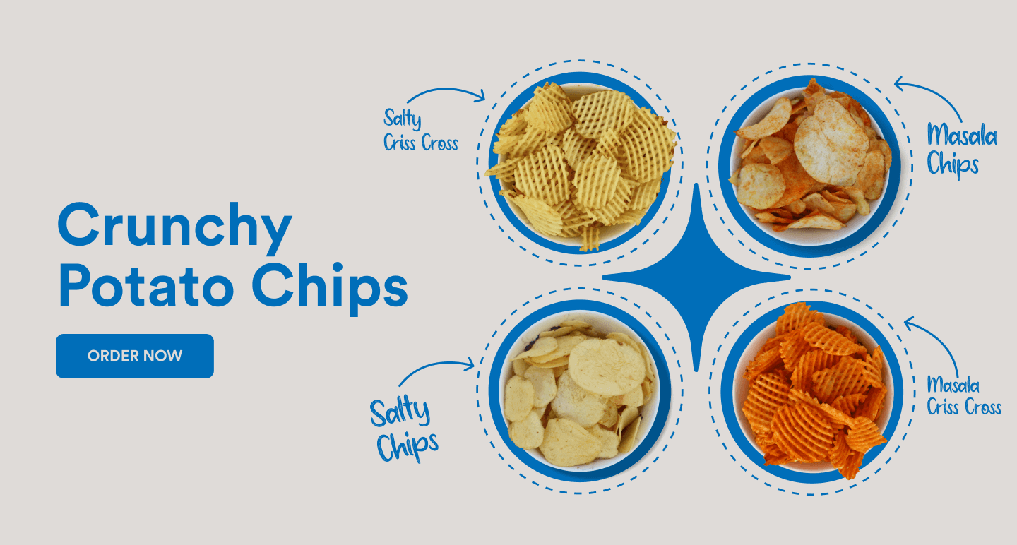 Our growing range includes Banana Chips, Chakri, Criss Cross Chips, Soya Sticks,