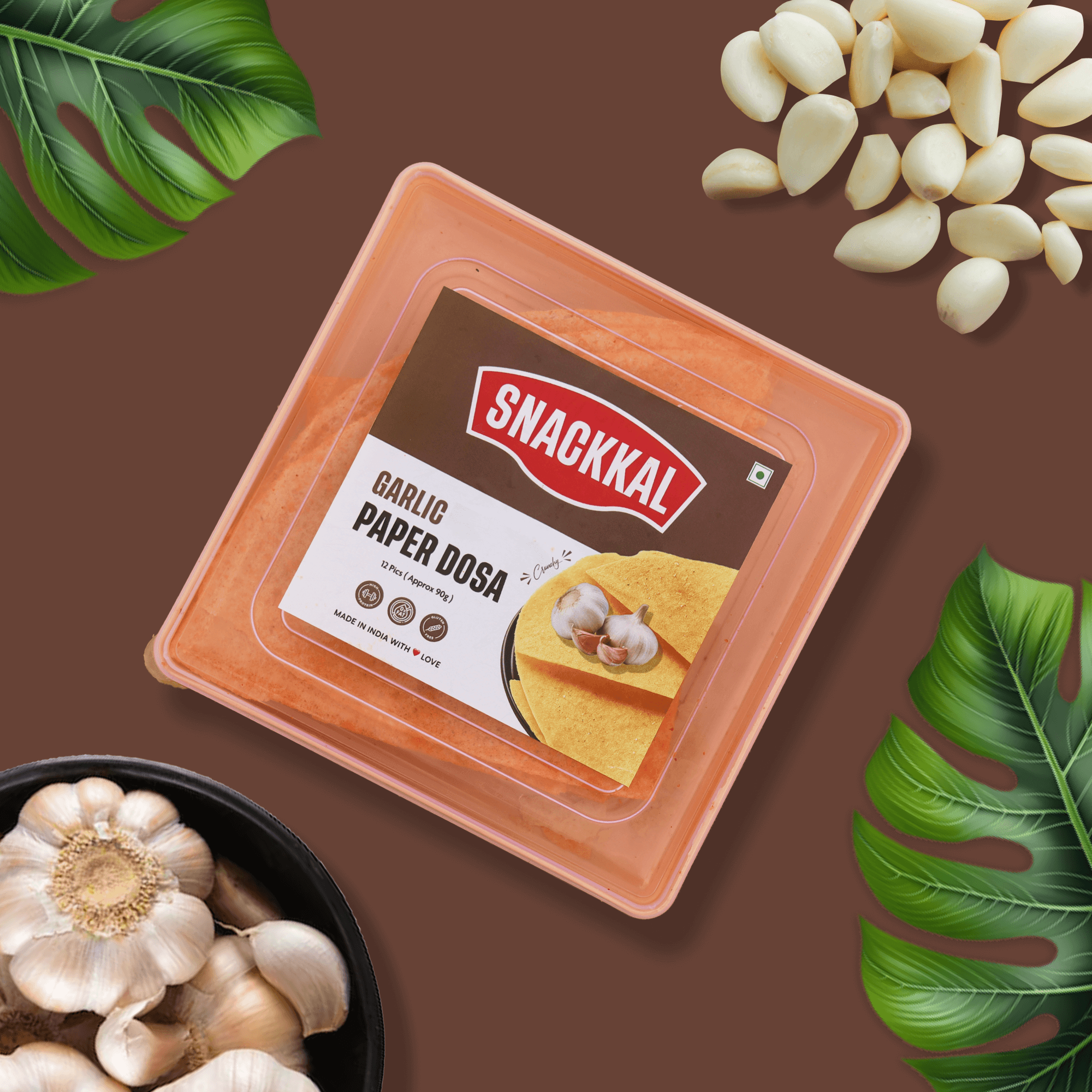Awaken your taste buds with Snackkal’s Garlic Paper Dosa—a savory twist on a South Indian classic. Expertly crafted from premium rawa and gram flour, each wafer-thin, crispy piece is infused with aromatic garlic powder and a subtle heat from chilly powder, all enriched with creamy butter and traditional spices. The result is an irresistible crunch paired with a fragrant garlic punch that transports you straight to the bustling streets of South India. Ready to eat with zero added preservatives and proudly made in India, this snack is perfect for tea-time, road trips, or whenever you crave that bold garlicky flavor.